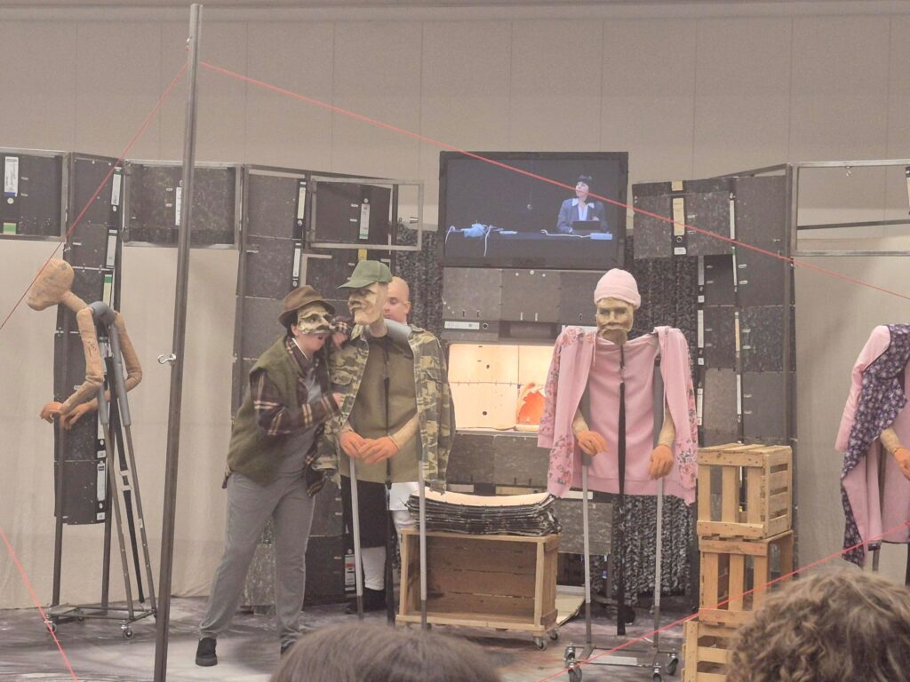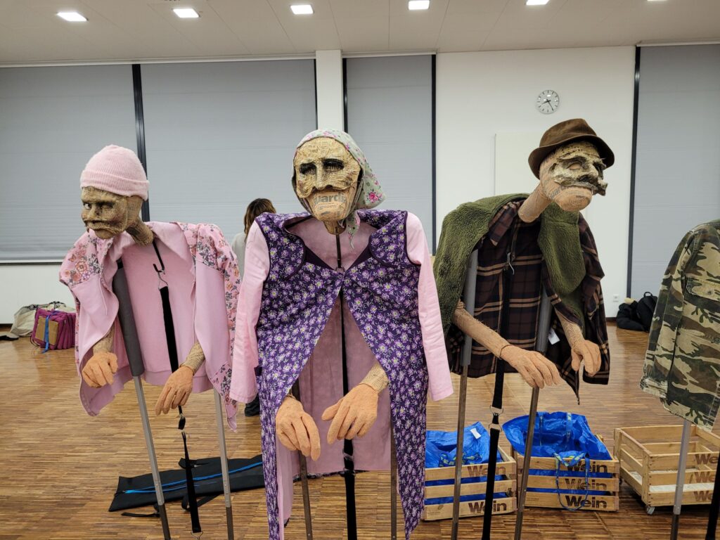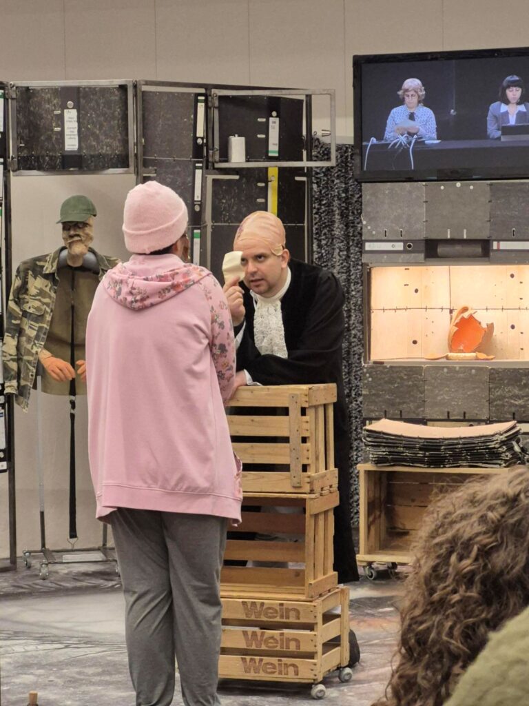 Das „THEATERmobileSPIELE“ aus Karlsruhe gastierte am Freitag, den 7.11.2025, mit zwei Aufführungen an unserer Schule. Das kleine aus zwei Schauspielern bestehende Ensemble brachte in der Aula Heinrich von Kleists „Der zerbrochne Krug“, ein Lustspiel in 13 Auftritten, zweimal zur Aufführung. Für das „Klassenzimmertheater“, das nach eigenem künstlerischem Selbstverständnis auf eine „intime Spielsituation“ Wert legt, Normalität aufbrechen und „Alltagsräume verwandeln“ will, wurde der Jahrgang der 12. Klasse des Beruflichen Gymnasiums, sieben Deutschkurse, in zwei Gruppen aufgeteilt. Von dem romantischen Imperativ „Poetisiert Euch!“ hatten alle Schülerinnen und Schüler schon gehört, Kleists Theater war für die meisten eher Neuland.