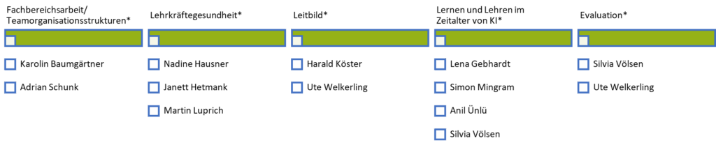 Aktuell stehen folgende Themenfelder im Fokus der Schulentwicklung (* – genannt sind die mitarbeitenden Steuergruppenmitglieder als Ansprechpartner/-innen):