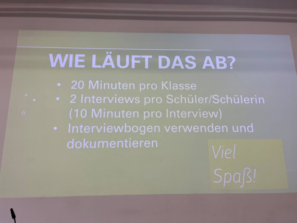 Im Vorfeld hatten die Lernenden einen Fragebogen erarbeitet, auf Basis dessen sie dann zwei Interviews mit Auszubildenden ihrer Wahl führen konnten, mit dem Ziel, sowohl Berufe als auch mögliche Ausbildungsbetriebe kennenzulernen. „Es war interessant, ich wusste nicht, wie die Ausbildung zur medizinischen Fachangestellten abläuft“ oder „den Beruf des Servicefahrers kannte ich vorher gar nicht“, waren die Rückmeldungen, die die Teilnehmenden zu der Veranstaltung äußerten. Und auch die Azubis zogen ein positives Fazit: „Sowas hätte ich mir früher auch an meiner Schule gewünscht.“